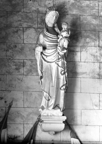 La statue de la Vierge à l'Enfant du 14e siècle a été dorée en 1732 pour la somme de 20 livres ; d'après Monsieur le Docteur Dollfus, la statue était exposée au revers de la façade ouest, avant sa restauration en 1949 ; la statue aurait été vraisemblablement décapitée à la Révolution.