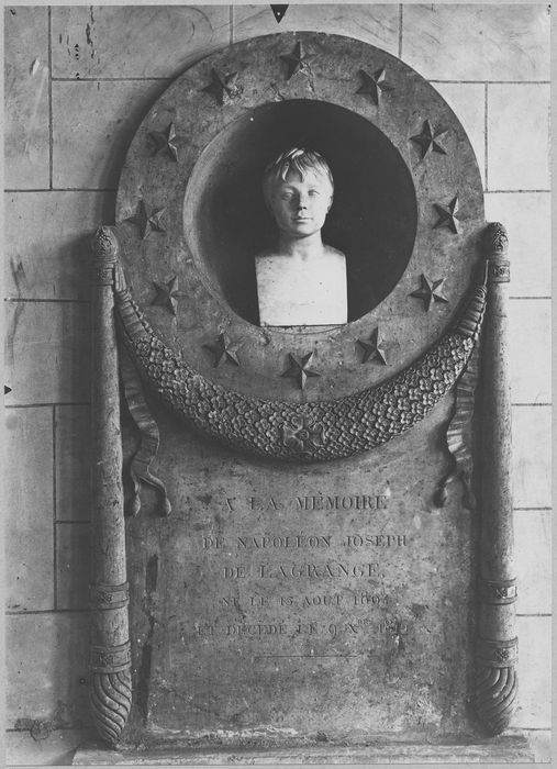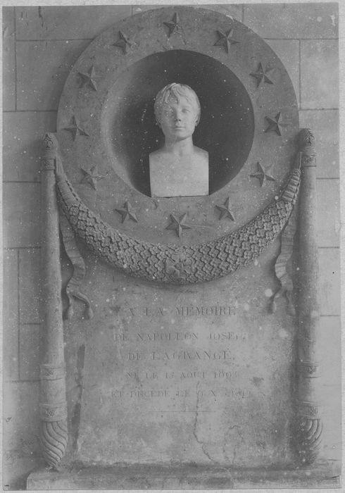 Dédicace, date : A la mémoire de Napoléon Joseph de Lagrange, né le 15 août 1804, et décédé les 9 Xbre 1812.