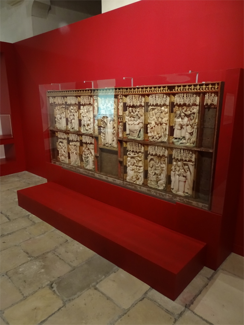 Ce retable est formé de scènes et de statuettes en albâtre autrefois peint et doré, ous des dais flamboyants de même nature, le tout encadré et maintenu par des encadrements de bois peint et doré. Dimensions approximatives.