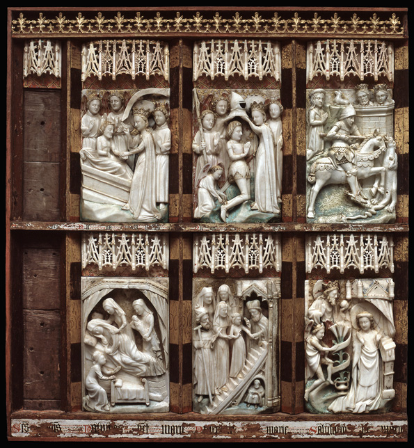 Retable des vies de la Vierge et de saint Georges dit aussi retable du maître-autel. Les bas-reliefs représentent des scènes de la Vie de la Vierge et de la Vie de saint Georges. Les statuettes sont Saint Antoine et son cochon, Saint Jean l'Evangéliste, Saint André, Saint Pierre, Sainte Brigitte ?, Sainte Madeleine, Saint Jacques le Majeur, Saint Paul, Une sainte, Sainte Barbe, Saint Christophe