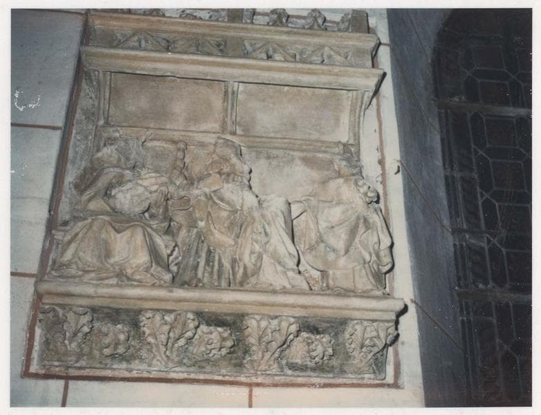 haut-relief : Priant présenté à la Vierge à l'Enfant par ses saints Patrons