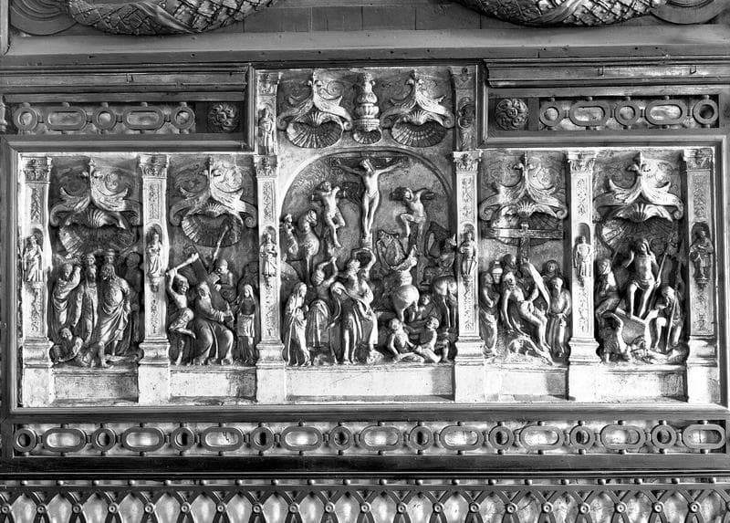 Ce retable est composé de cinq compartiments séparés par des pilastres ; la partie centrale est plus grande et est surmontée d'un entablement rectangulaire horizontal ; traces de polychromie.