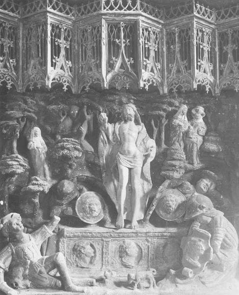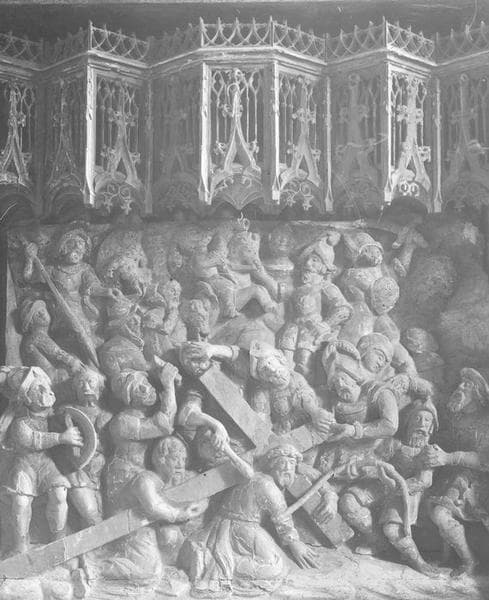 retable, bas-reliefs, cadre : Trois scènes de la Passion (œuvre volée)