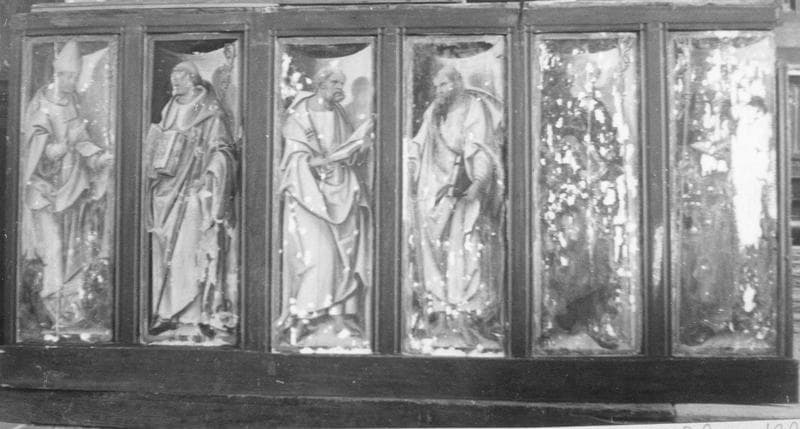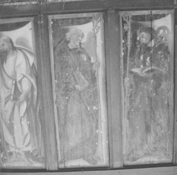 devant de l'autel secondaire sud (panneau peint) : Saint Blaise (?), Saint abbé, Saint Pierre, Saint Paul, Deux abbés vêtus de noir