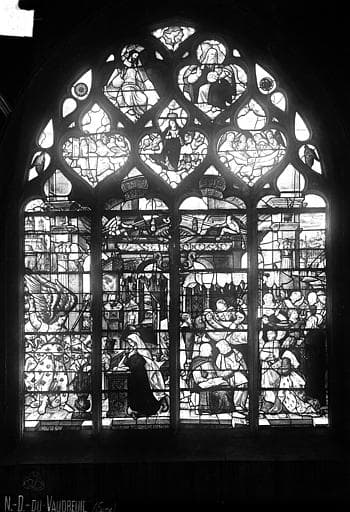 Ces verrières représentent : le Triomphe de la Vierge (grande fenêtre de la façade), l'Annonciation, la Mort de la Vierge et l'Assomption (fenêtre du croisillon sud).