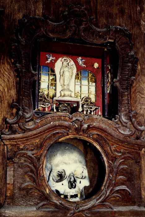 En partie haute, derrière la vitre, un petit reliquaire carré contient de nombreuses reliques disposees dans une scène représentant un autel surmonté par une statue de Vierge à l'Enfant, et, à l'avant, des silhouettes peintes de personnages en buste (un gentilhomme, une religieuse ?). En partie basse, derrière un couvercle circulaire orné de La Colombe de l'Esprit Saint, se trouve un crâne humain. L'encadrement présente des courbes et contrecourbes. Le tout est intégré dans le lambris de cette petite pièce.
