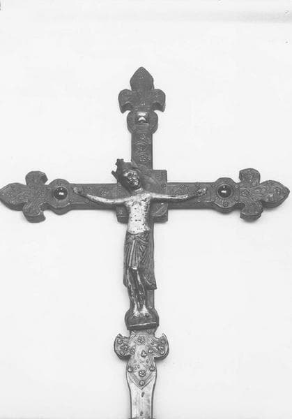 Le Christ, du 12e siècle, est en cuivre émaillé limousin. La croix, du 15e siècle, en cuivre repoussé sur âme de bois, avec trois cabochons, est ornée au dos, au centre, de l'Agneau Mystique, et, à l'extrémité des quatre bras, des symboles des quatre Evangélistes.