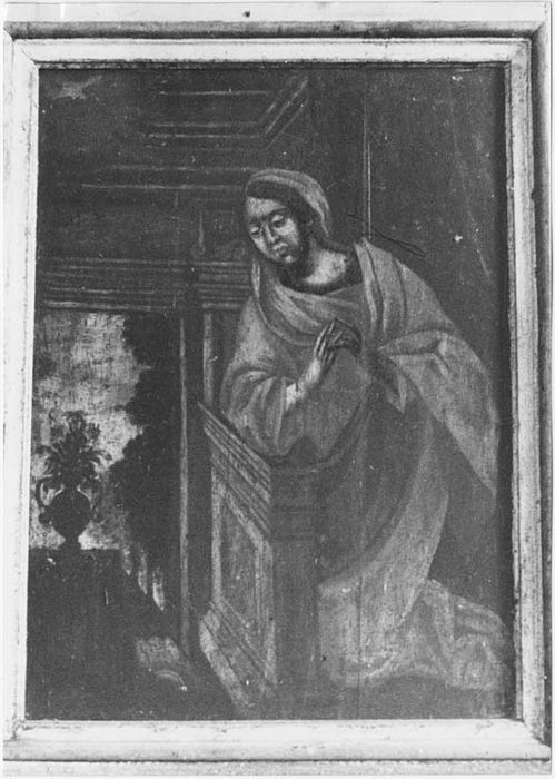 Deux petits panneaux peints à l'huile sur bois représentant la Vierge de l'Annonciation et l'archange Gabriel, sur le retable du maître-autel.