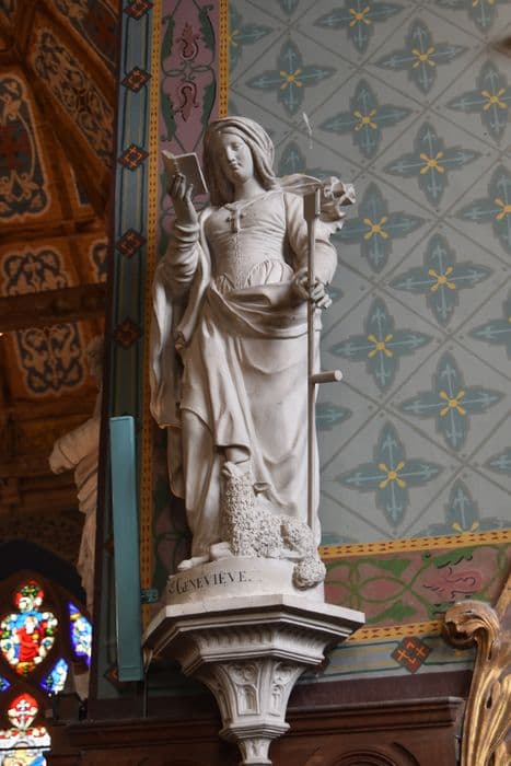 six statues : Saint Joseph, Sainte Geneviève, Saint Pierre, Saint Paul, Saint évêque (Saint Martin ou Saint Sulpice ?) et Sainte Philomène