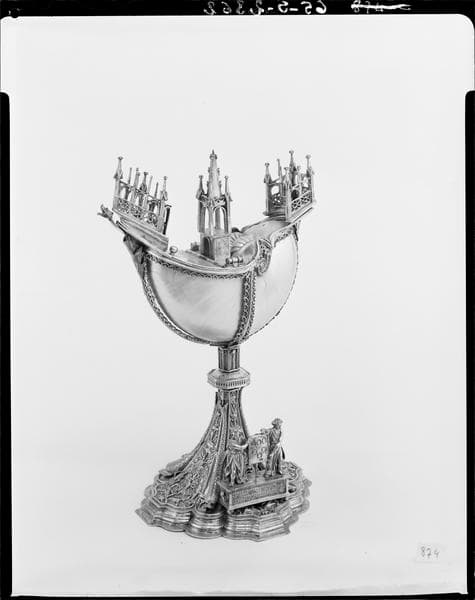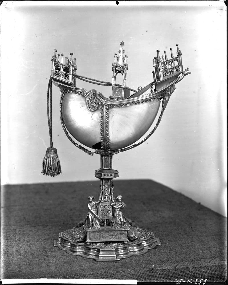 Coquille de nautile décapée retenue par des bandes d'argent doré et montée en forme de navire sur un pied ; la réserve à encens s'ouvre par une trappe dans le pont.