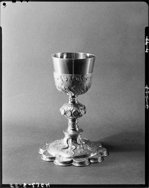 Assiette d'apprêt marron, noeud décoré d'émaux translucides ; pied à 10 lobes, tige d'enfilage.
