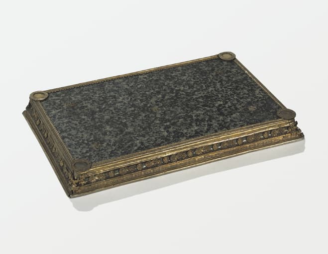 mica (gris) : taillé ; argent : doré, ciselé, estampage, décor rapporté