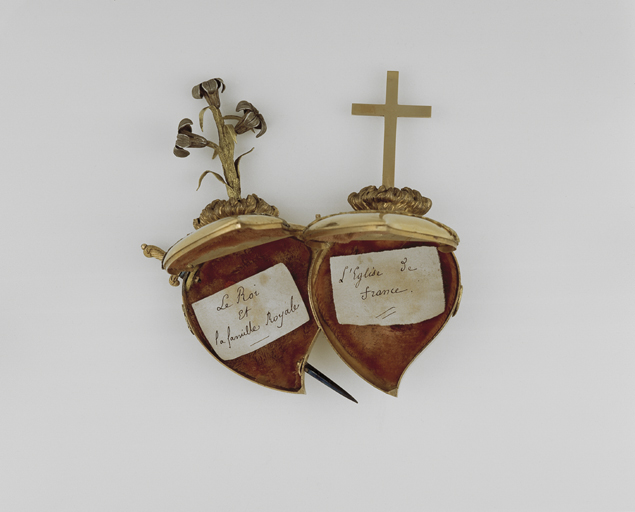 Chaque coeur renferme un papier avec un texte écrit à la plume : LE ROI ET LA FAMILLE ROYALE, L'EGLISE DE FRANCE.