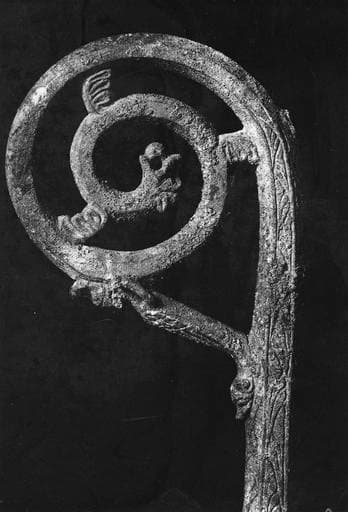 Crosse emmanchée dans un bâton de bois fixé sur un socle.