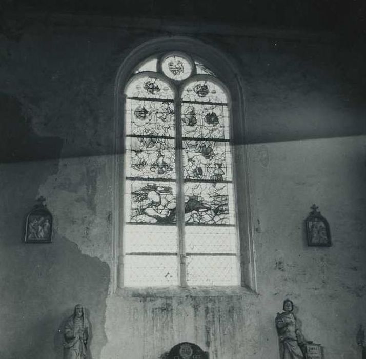 Fragments du 16e siècle dans les parties supérieures des baies (têtes de lancettes et ajours des tympans), le reste est garni de losanges ; vitrail provenant de la baie 3 remonté sur la baie 5 en 1909.