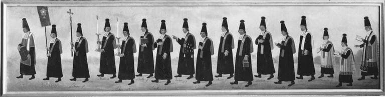 Procession de prêtres en vêtements liturgiques, certains ont le regard tournés vers l'extérieur du tableau.
