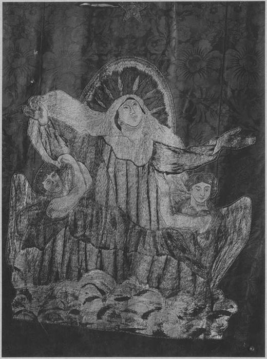 bannière de procession brodée avec représentation de la Charité de saint Martin et de l'Assomption de la Vierge