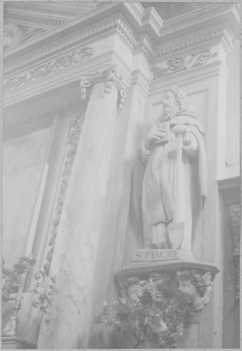 Décor de guirlandes de fleurs, feuilles, rubans, entrelacs, pots à feu et têtes d'angelots ; fronton orné de la colombe du Saint-Esprit et de deux anges assis sur ses rampants ; saint Fiacre est à droite, saint Pierre à gauche.