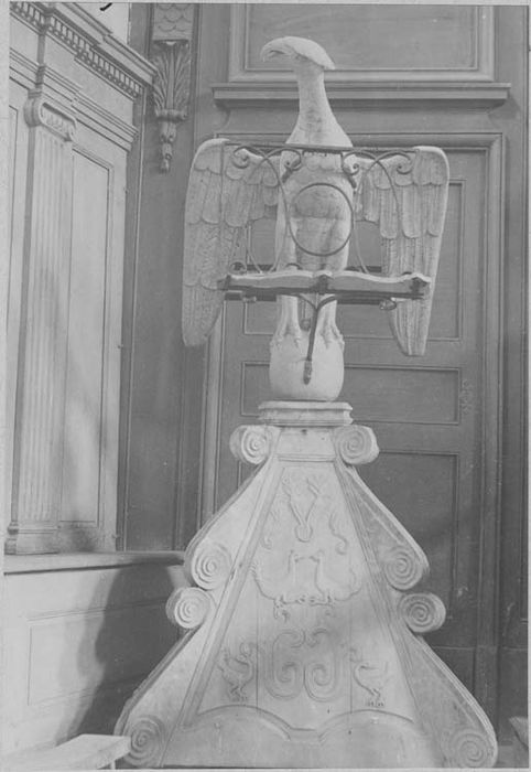 Aigle posé sur le globe ; trépied plein triangulaire décoré de rinceaux, d'un agneau Pascal sur l'un des côtés et de volutes aux angles.