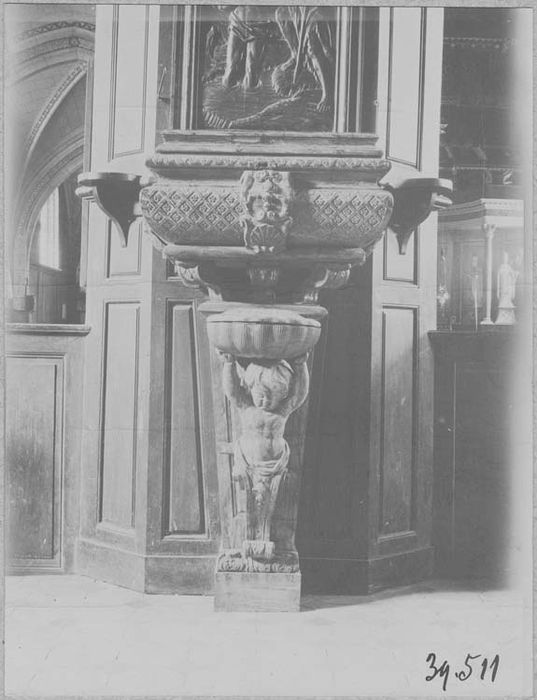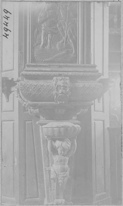 Le bas-relief représente le Baptême du Christ ; sur la cuve : décor de volutes, losanges, anges ; un petit atlante supporte la coquille.