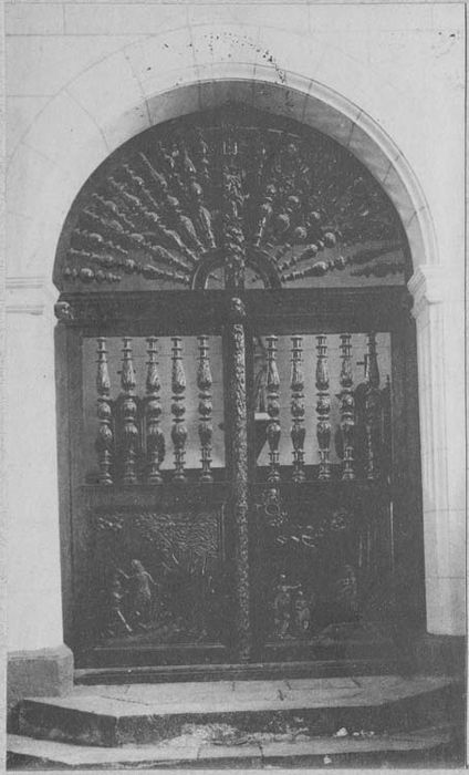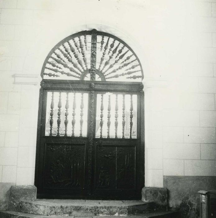La moitié supérieure des vantaux et le dessus de porte en plein cintre sont à claire voie, la moitié inférieure de chaque vantail est sculptée