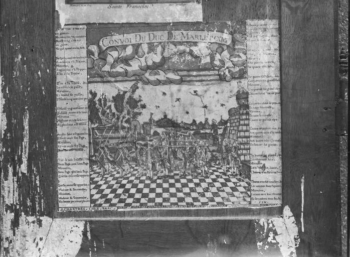 sur le battant gauche, de haut en bas : NOTRE-DAME DU PAS... (fin illisible), SAINTE FRANÇOISE, LE CONVOI DU DUC DE MARLBOROUGH ; sur le battant droit : SAINTE JEANNE DE FRANCE