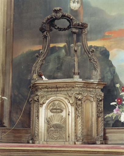 Ensemble du maître-autel, du tabernacle et du retable du choeur. Autel galbé (dit en tombeau), en bois sculpté de moulures et d'un décor de guirlandes de fleurs et de rubans entremêlés à une croix et un coeur. Le tabernacle, en bois sculpté, se compose de trois pans ornés de feuilles d'acanthe, d'enroulements, d'épis de blé et de grappes de raisin. La porte du tabernacle présente un décor avec l'agneau mystique couché sur le livre aux sept sceaux. Le tabernacle est surmonté d'une exposition faite de volutes et d'une couronne de roses en bois sculpté. Retable architecturé à pilastres cannelés et chapiteaux composites soutenant une corniche cintrée, sommée de nuées sculptées (stuc ?) d'où émergent des chérubins, des rayons, le symbole de la Trinité et une croix. La toile n'est pas d'origine.