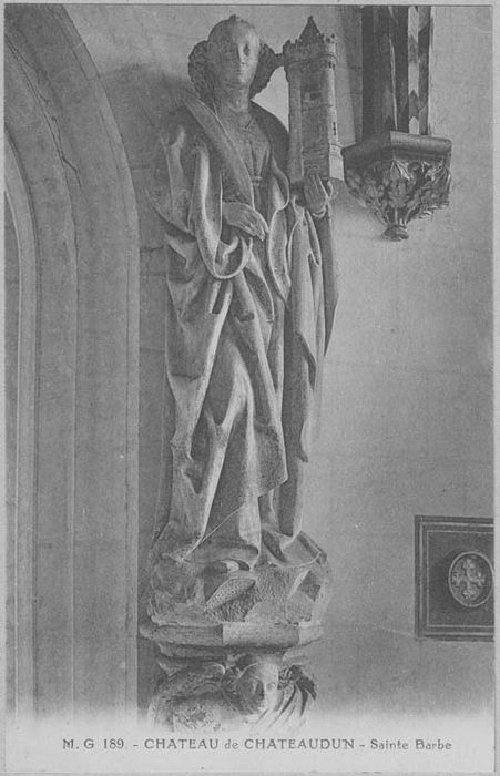 Jean d'Orléans, fidèle du dauphin Charles, compagnon de Jeanne d'Arc, reçut en 1439 le comté de Dunois et la vicomté de Châteaudun où il établit sa résidence principale. En 1451, il décida de bâtir une chapelle à l'emplacement de l'ancienne chapelle Notre-Dame du château. Dès l'origine, envisagée comme sainte-chapelle, elle fut dédiée à la Vierge, à saint Jean-Baptiste et aux saints anges. Ce château bénéficie d'une importante étude réalisée par Monique Chatenet, qui a repéré trois campagnes de travaux : de 1451 à 1454, de 1460 à 1464 et autour de 1493. Cette chapelle présente deux niveaux : une chapelle haute dédiée à saint Vincent et une chapelle basse où se trouve l'ensemble de sculptures formant le programme de la sainte chapelle voulue par Jean Dunois. La chapelle abrite 15 sculptures (PM28000979 à PM28000994) disposées sur des colonnes surmontées de chapiteaux. Elles sont détachées du mur et posées avec un joint de scellement sur ces chapiteaux. On peut en isoler 3 : les sculptures de sainte Agnès (PM28000993) et de saint François d'Assise(PM28000992) datées autour de 1493, de plus petites dimensions et celle de Jean Dunois (PM28000994), conçue sans doute pour un édifice civil. La décoration date de la campagne de travaux de 1460-1464. Elle comprenait 12 statues aux chapiteaux décorés d'anges. On note l'inspiration réaliste dans les attitudes et les draperies et le côté idéalisé avec les proportions allongées des corps et les expressions des visages. Les vêtements reçurent une riche polychromie encore bien conservée. L'iconographie reprend la dédicace à la Vierge, datée vers 1400 et à saint Jean-Baptiste. Pour le reste des sculptures, l'iconographie est à rapprocher de l'illustration du livre d'heure de Dunois, conservé au British Museum (Londres), et décoré à Paris vers 1440, à l'exception de sainte Radegonde (PM28000989) qui fait l'objet d'une dévotion locale, comme sainte Madeleine (PM28000986). Cet ensemble présente d'une part une originalité dans le programme iconographique et d'autre part une qualité manifeste de la sculpture. Des rapprochements ont été fait avec l'art de la Bourgogne, la sculpture tourangelle (Val de Loire selon Elisabeth Taburet-Delahaye) et le Brabant (étude de Sophie Guillot de Suduiraut : groupe en rapport daté de 1460).