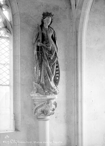Jean d'Orléans, fidèle du dauphin Charles, compagnon de Jeanne d'Arc, reçut en 1439 le comté de Dunois et la vicomté de Châteaudun où il établit sa résidence principale. En 1451, il décida de bâtir une chapelle à l'emplacement de l'ancienne chapelle Notre-Dame du château. Dès l'origine, envisagée comme sainte-chapelle, elle fut dédiée à la Vierge, à saint Jean-Baptiste et aux saints anges. Ce château bénéficie d'une importante étude réalisée par Monique Chatenet, qui a repéré trois campagnes de travaux : de 1451 à 1454, de 1460 à 1464 et autour de 1493. Cette chapelle présente deux niveaux : une chapelle haute dédiée à saint Vincent et une chapelle basse où se trouve l'ensemble de sculptures formant le programme de la sainte chapelle voulue par Jean Dunois. La chapelle abrite 15 sculptures (PM28000979 à PM28000994) disposées sur des colonnes surmontées de chapiteaux. Elles sont détachées du mur et posées avec un joint de scellement sur ces chapiteaux. On peut en isoler 3 : les sculptures de sainte Agnès (PM28000993) et de saint François d'Assise(PM28000992) datées autour de 1493, de plus petites dimensions et celle de Jean Dunois (PM28000994), conçue sans doute pour un édifice civil. La décoration date de la campagne de travaux de 1460-1464. Elle comprenait 12 statues aux chapiteaux décorés d'anges. On note l'inspiration réaliste dans les attitudes et les draperies et le côté idéalisé avec les proportions allongées des corps et les expressions des visages. Les vêtements reçurent une riche polychromie encore bien conservée. L'iconographie reprend la dédicace à la Vierge, datée vers 1400 et à saint Jean-Baptiste. Pour le reste des sculptures, l'iconographie est à rapprocher de l'illustration du livre d'heure de Dunois, conservé au British Museum (Londres), et décoré à Paris vers 1440, à l'exception de sainte Radegonde (PM28000989) qui fait l'objet d'une dévotion locale, comme sainte Madeleine (PM28000986). Cet ensemble présente d'une part une originalité dans le programme iconographique et d'autre part une qualité manifeste de la sculpture. Des rapprochements ont été fait avec l'art de la Bourgogne, la sculpture tourangelle (Val de Loire selon Elisabeth Taburet-Delahaye) et le Brabant (étude de Sophie Guillot de Suduiraut : groupe en rapport daté de 1460).