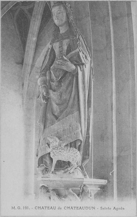 Jean d'Orléans, fidèle du dauphin Charles, compagnon de Jeanne d'Arc, reçut en 1439 le comté de Dunois et la vicomté de Châteaudun où il établit sa résidence principale. En 1451, il décida de bâtir une chapelle à l'emplacement de l'ancienne chapelle Notre-Dame du château. Dès l'origine, envisagée comme sainte-chapelle, elle fut dédiée à la Vierge, à saint Jean-Baptiste et aux saints anges. Ce château bénéficie d'une importante étude réalisée par Monique Chatenet, qui a repéré trois campagnes de travaux : de 1451 à 1454, de 1460 à 1464 et autour de 1493. Cette chapelle présente deux niveaux : une chapelle haute dédiée à saint Vincent et une chapelle basse où se trouve l'ensemble de sculptures formant le programme de la sainte chapelle voulue par Jean Dunois. La chapelle abrite 15 sculptures (PM28000979 à PM28000994) disposées sur des colonnes surmontées de chapiteaux. Elles sont détachées du mur et posées avec un joint de scellement sur ces chapiteaux. On peut en isoler 3 : les sculptures de sainte Agnès et de saint François d'Assise (PM28000992) datées autour de 1493, de plus petites dimensions et celle de Jean Dunois (PM28000994), conçue sans doute pour un édifice civil. La décoration date de la campagne de travaux de 1460-1464. Elle comprenait 12 statues aux chapiteaux décorés d'anges. On note l'inspiration réaliste dans les attitudes et les draperies et le côté idéalisé avec les proportions allongées des corps et les expressions des visages. Les vêtements reçurent une riche polychromie encore bien conservée. L'iconographie reprend la dédicace à la Vierge, datée vers 1400 et à saint Jean-Baptiste. Pour le reste des sculptures, l'iconographie est à rapprocher de l'illustration du livre d'heure de Dunois, conservé au British Museum (Londres), et décoré à Paris vers 1440, à l'exception de sainte Radegonde (PM28000989) qui fait l'objet d'une dévotion locale, comme sainte Madeleine (PM28000986). Cet ensemble présente d'une part une originalité dans le programme iconographique et d'autre part une qualité manifeste de la sculpture. Des rapprochements ont été fait avec l'art de la Bourgogne, la sculpture tourangelle (Val de Loire selon Elisabeth Taburet-Delahaye) et le Brabant (étude de Sophie Guillot de Suduiraut : groupe en rapport daté de 1460).