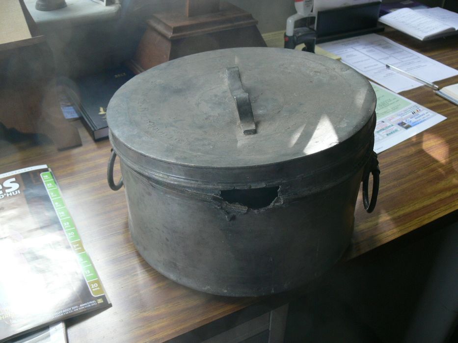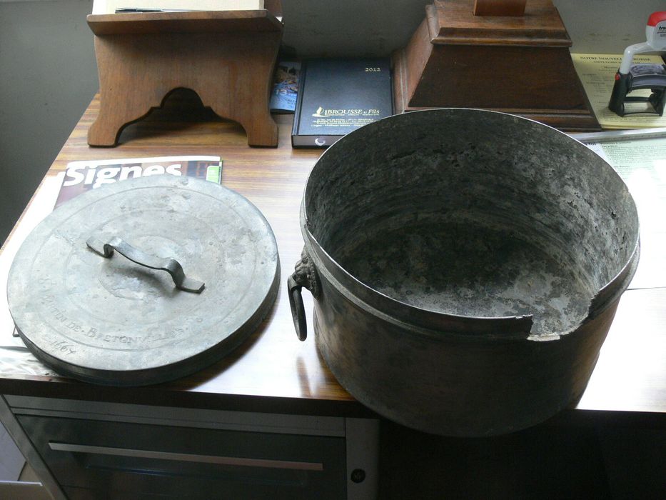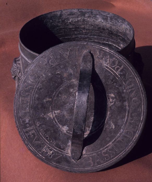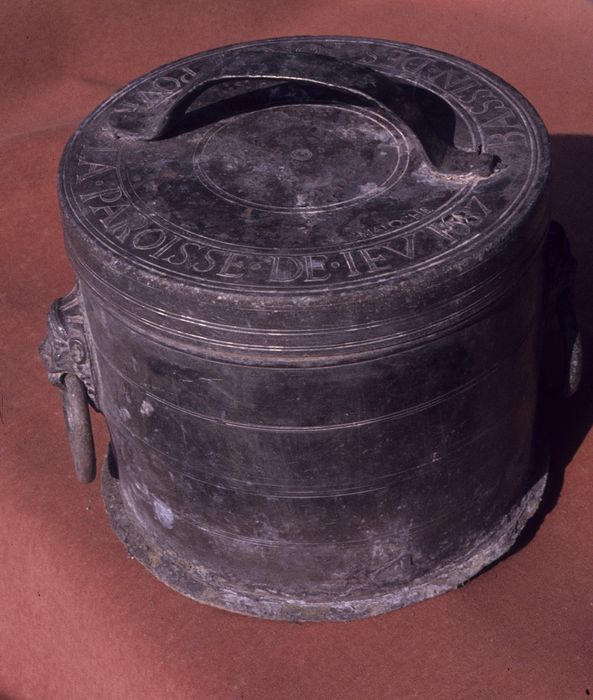 Réserve pour les saintes huiles en étain pourvue de deux mufles de lion tenant des anneaux de préhension. Inscription ciselée sur le couvercle.