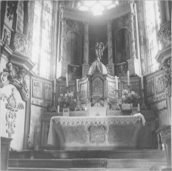 retable, 5 bas-reliefs : la Cène, le Grand prêtre et David, la Manne, la Manducation de l'Agneau, le Sacrifice d'Abraham