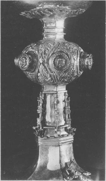 Pied à six lobes en accolade. Tranche décorée de fins rinceaux dorés. Crucifix en argent doré sur un côté. Tige ornée d'une frise dorée et de petits contreforts verticaux se terminant par des têtes de gargouilles dorées. Noeud à décor de feuilles orné de six boutons à têtes d'angelots. Feuilles dorées au départ de la coupe qui extérieurement en argent avec bord doré.