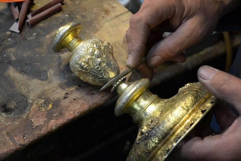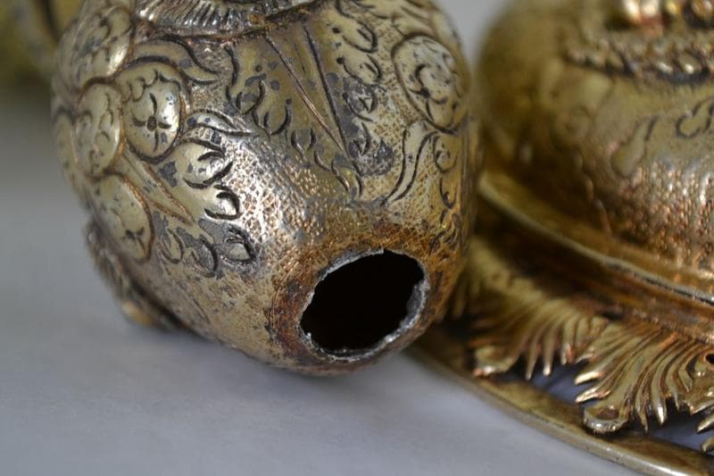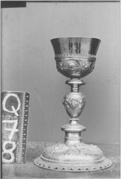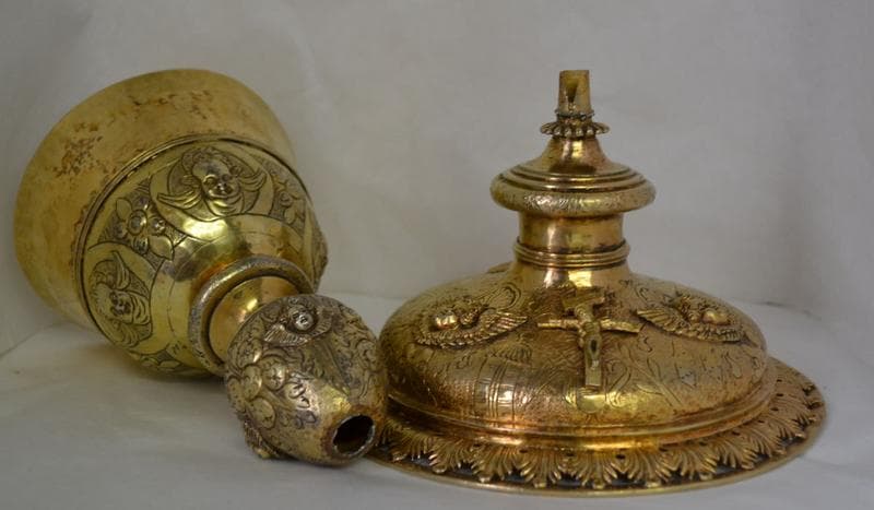Pied à frise dentelée, au décor gravé des instruments de la Passion et trois têtes d'angelots ailés rapportés. Haute tige avec noeud orné de gros fruits et de trois têtes d'angelots ailés. Fausse coupe décorée de trois têtes d'angelots ailés non rapportées et de gros fruits.