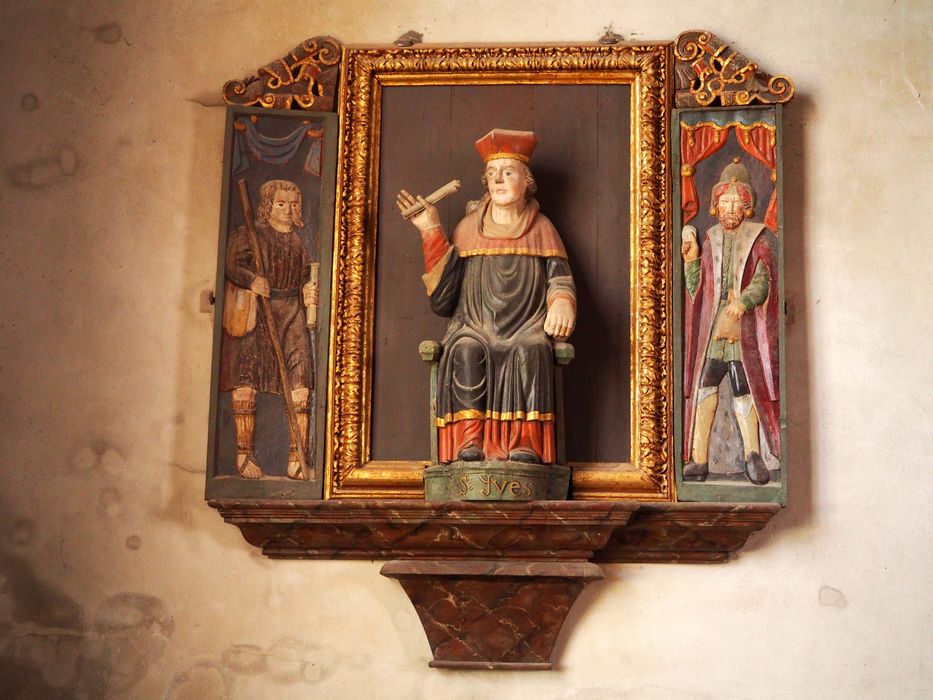 statue, 2 reliefs : Saint Yves assis entre le riche et le pauvre