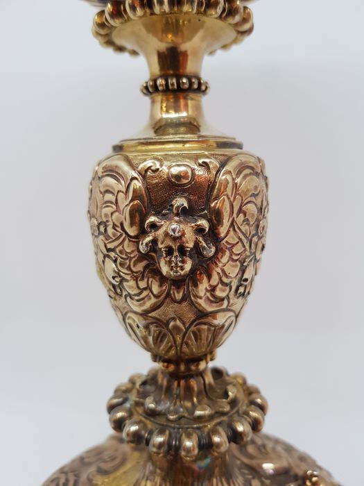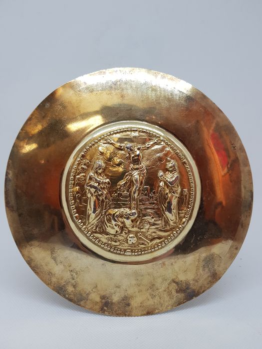 Frise dentelée ajourée. Pied rond à décor des Instruments de la Passion et trois têtes d'angelots rapportées. Haute tige à double collerette. Noeud à décor d'angelots (trois têtes rapportées). Fausse coupe décorée des Instruments de la Passion et de trois têtes d'angelots rapportées. Coupe unie. Le Calvaire orne le centre de la patène.