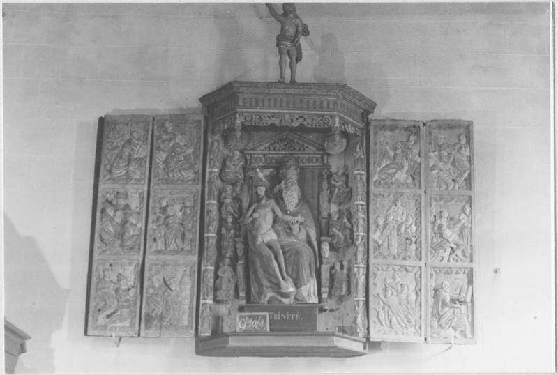 Triptyque constitué d'une niche centrale à volets. Dans la niche centrale se situe une statue d'un père éternel assis portant le Christ avec une colombe qui évoque le saint Esprit, cette scène encadre deux rangées de cariatides, d'apôtres et d'anges surmontées de la lune et du soleil. Les volets représentent des prophètes, des patriarches et des martyrs sculptés. Une statue du Christ ressuscité domine la niche centrale.