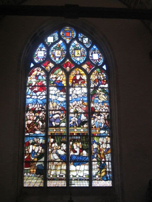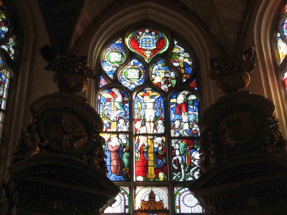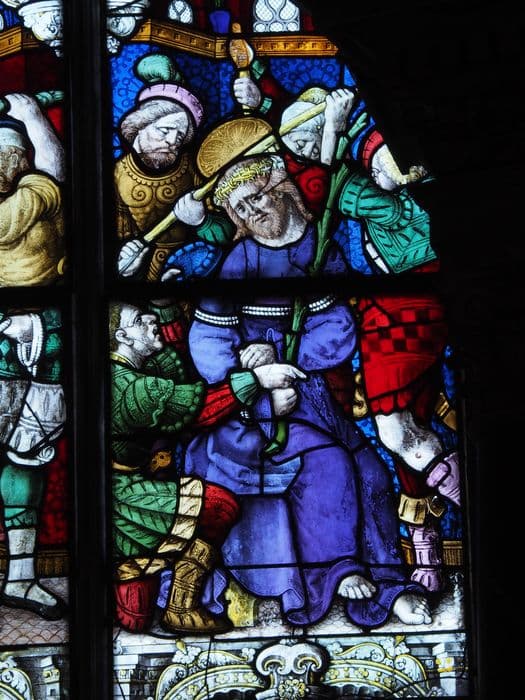 Au centre de la verrière de l'abside est représentée la Crucifixion.