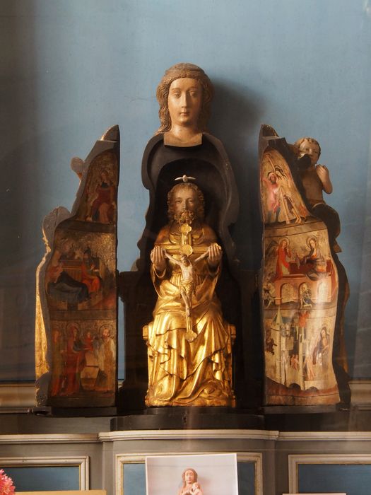 A l'intérieur de la statue, sont un groupe sculpté représentant la Trinité et quatre panneaux peints.