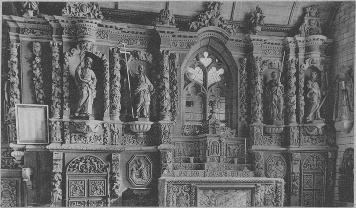 Concernant le retable central : un très long autel prend place devant le vitrail. Au-dessus un tabernacle posé sur des gradins coupés et remaniés. Il est composé de deux volets latéraux. Au-dessus des volets, deux frontons arrondis portent des statuettes d'anges assis sur les rampants. Au centre, deux anges debout, les bras levés devaient tenir un dais ou une couronne. des pots à feux et à fleurs soulignent l'ensemble du tabernacle. Pour porter l'entablement, il subsiste deux colonnettes e chaque côté des volets. Les colonettes manquantes ont été remplacées par six statuettes d'anges. de chaque côté du vitrail, deux niches encadrées de colonnes torsadées à chapiteaux corinthiens reçoivent deux statues, à gauche Joachim, à droite saint Joseph. A leurs côtés, deux autres niches occupées à gauche par sainte Marie, à droite par sainte Anne. les deux femmes se font face. Ces niches sont couronnées par des médaillons sur panneaux de bois : à gauche, une tête d'ange enrubannée de feuillages et de fleurs, le médaillon est orné d'un croix, un aigle occupe le côté droit ; à droite, une tête d'ange enrubannée de feuillages et de fleurs, le médaillon est orné d'un calice, un aigle occupe le côté gauche. Au-dessus du vitrail, le père éternel sort d'un nuage, deux têtes d'anges à ses côtés soutiennent une longue draperie qui vient couronner la fenêtre. Description iconographique : 4 niches latérales au vitrail dans lesquelles prennent place, de gauche à droite, sainte Marie, saint Joachim, saint Joseph et sainte Anne. La porte du tabernacle est sculptée d'une représentation du sacrifice d'Isaac (Abraham tient de sa main gauche l'épaule d'Isaac tandis que de sa main droite armée d'un glaive est arrêtée par un ange). Sur les volets du tabernacle, présence de deux médaillons, à gauche la Nativité (l'enfant repose sur un pan de tissu qui recouvre la mangeoire ; il semble regarder sa mère, légèrement penchée devant lui, en arrière plan, présence de saint Joseph) à droite, représentation de l'Assomption, Marie monte au ciel accompagnée par des anges. Quatre statuettes assises en enfilade sur les volets du tabernacle représentent les évangélistes : de gauche à droite Mathieu, Luc, Marc et Jean. Sur les panneaux latéraux du tabernacle, deux niches abritent à gauche saint Jean et à droite saint Luc. Sur la contre-table de l'autel, deux médaillons sont présentés latéralement. A gauche, représentation de l'Annonciation (le saint Esprit représenté sous la forme d'un colombe marque le caractère surnaturel de la scène. La Vierge se tient près d'un livre ouvert sur la prédiction d'Isaïe, à sa droite l'ange Gabriel tient un lis dans sa main gauche et pointe l'index droit vers le ciel) à droite, la Visitation (rencontre de deux femmes, la scène se passe en plein air devant une maison).£Concernant le retable nord : des soubassements latéraux à l'autel, richement sculptés d'anges, de chutes de feuillages, de fleurs, de médaillons et de scènes iconographiques. Sur l'autel, un tabernacle avec deux rangées de gradins sculptés, légèrement recoupés sur la longueur ; au-dessus, deux anges prennent appui sur un dôme qui était en fait un dais se positionnant bien plus haut ; un pot à fleurs couronne ce dais. De chaque côté du vitrail, deux niches encadrées de chutes de feuillages et de fleurs où prennet place à gauche saint Jean-Baptiste et saint Laurent, à droite sainte Marie-Madeleine. Au-dessus du vitrail, un dais est fixé sur le mur. L'ensemble est rythmé de six colonnes à chapiteaux corinthiens ; ces colonnes portent un entablement classique. L'architrave et la frise ont été coupées afin de laisser un emplacement pour des éléments sculptés apocryphes prenant place au-dessus de chaque niche. Description iconographique, de gauche à droite, nous trouvons dans les niches : saint Jean-Baptiste, saint Laurent, saint Louis et sainte Marie-Madeleine tandis que les bas reliefs sous les niches représentent : le baptême du Christ (composition simple, Jésus est représenté dans l'attitude de la prière, recevant sur sa tête l'eau baptismal versée par Jean. La colombe du saint Esprit plane au-dessus du Christ. Présence d'un ange envoyé du ciel qui participe à la solennité de l'instant) saint Laurent (le saint porte la dalmatique du diacre et le gril de son supplice. Sur la droite, un personnage plus petit semble lui parler) saint Louis (représentation du saint en buste, il porte une couronne royale fleurdelisée qui a été bûchée, appuyée sur une épée et un sceptre formant un X) bas-relief de trois femmes, elles sont les unes derrière les autres, elles portent des vases. La première, sainte Madeleine, est agenouillée aux pieds d'un ange, derrière lequel on devine un tombeau. En toile de fond, des paysages et des architectures.£Concernant le retable sud : un autel surmonté d'un tabernacle à deux volets latéraux et de deux ra, gées de gradins. Dans les soubassements, deux portes sculptées. l'une d'elle donne accès à la sacristie. Ces portes sont encadrées de consoles d'où jaillissent des chutes de feuillages et de fleurs, et surmontées de frontons richement sculptés d'une tête d'ange centrale. Des statues d'anges assis sur les rampants des volutes tiennent d'une main un vase à fleurs, et de l'autre des guirlandes de feuillages et de fleurs. Au-dessus des stylobates, représentation des évangélistes, de gauche à droite : Marc, Mathieu, Luc et Jean. Ces stylobates portent une grande architecture de colonnes torsadées agrémentées de feuilles de vignes, de grappes de raisin et d'oiseaux. Elles encadrent les niches et les statues de saint Jacques, saint Pierre, saint Paul et saint André. Au-dessus, architrave, frise et corniche règnent sur tout la longueur du retable. Enfin, des cartouches à ailerons et des pots à fleurs viennent couronner ce retable. Le côté gauche du retabl