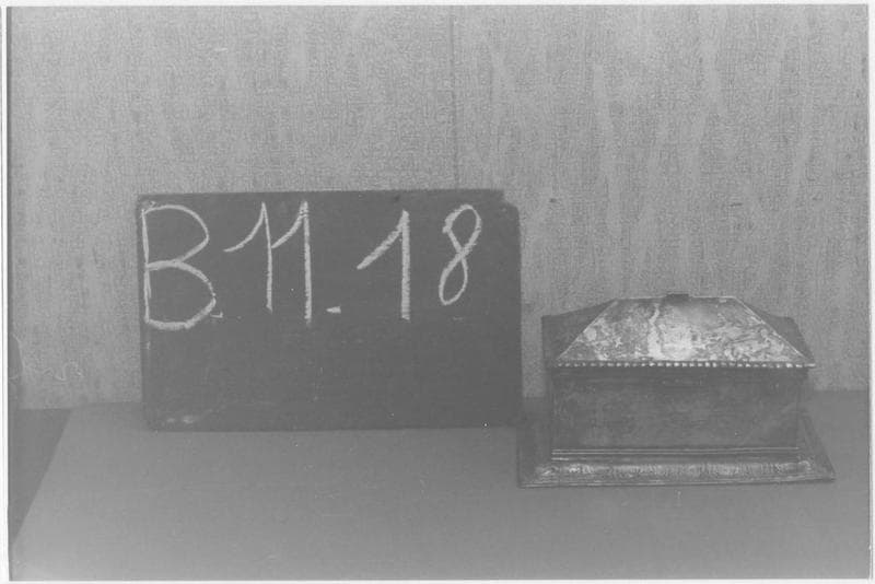 La bordure est rectangulaire, à profil en doucine. Le corps est à parois droites et lisses. Le couvercle est à quatre pans droits. La croix du sommet est disparue. La fermeture se fait par une clavette qui a disparu.