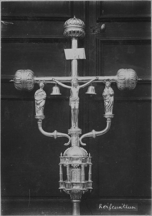 Simple croisillon portant deux clochettes. Bras terminés par une boule formée de deux hémisphères jointifs à godrons. Noeud hexagonal formant édicule porté par six colonnettes supportant un dôme.