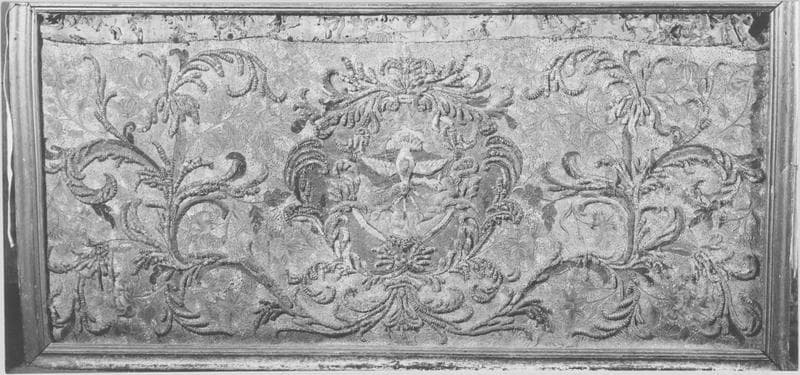 bois : taillé, polychrome ; soie : brodé ; fil métal ; perle