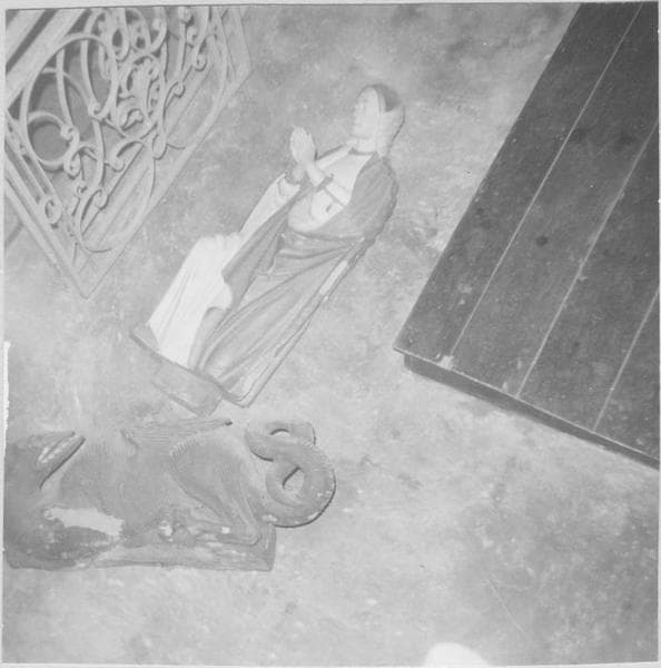 La statue représente sainte Marguerite terrassant un dragon, ou bien sainte Marthe terrassant la Tarasque.