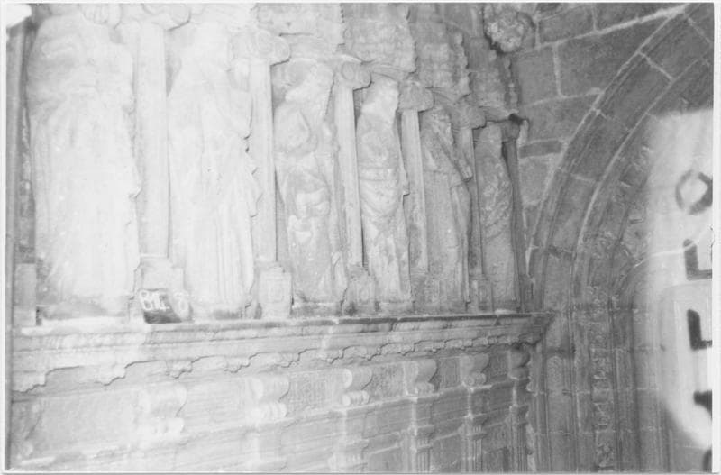 Ces statues se trouvent à l'intérieur du porche, de chaque côté, séparées par des colonnes ioniques, sous des dais couronnés des croissants, au-dessus d'un soubassement formé de pilastres cannelés.