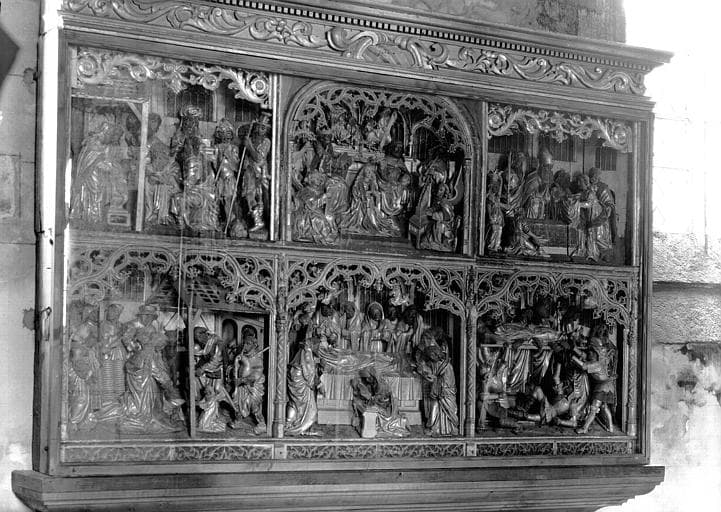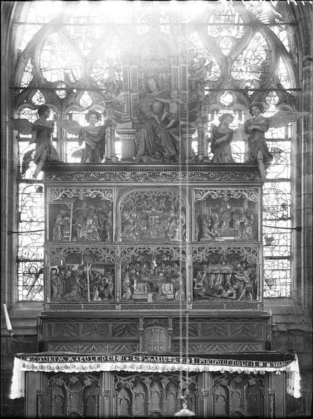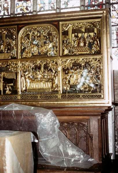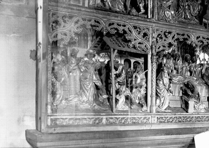 11 statuettes volées le 6-7 novembre 1973, 3 retrouvées en avril 1978. Il manque à l'adoration des mages (panneau supérieur gauche) : deux rois mages agenouillés ; à l'adoration des bergers (panneau inférieur gauche) : la Vierge et l'enfant Jésus (mutilé), saint Joseph, un berger à cornemuse et une bergère à lanterne, l'ange agenouillé en prière a été retrouvé en 1978 ; à la dormition de la Vierge (panneau en bas au centre) : un apôtre agenouillé devant un banc lisant un livre de prière, l'apôtre barbu debout du premier plan à gauche (saint Pierre), l'apôtre debout lisant du premier plan à droite ; aux funérailles de la Vierge (panneau inférieur droit) : le soldat juif du premier plan à gauche a été retrouvé en 1978 ; au couronnement de la Vierge (panneau central du haut) : un ange musicien a été retrouvé en 1978.