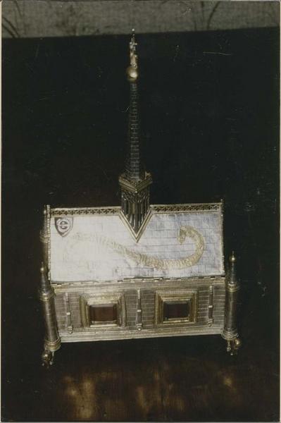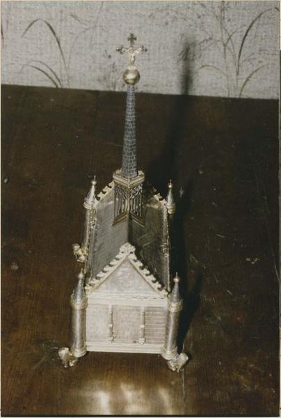 Châsse en argent massif : en forme de chapelle, rectangulaire coiffée d'un couvercle à quatre pans surmonté d'une crête ajourée. L'écrin en cuir a la même forme que la châsse.