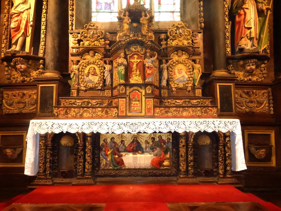 Maître-autel, son retable, quatre statues (Christ tenant la croix, Saint Pierre, Vierge à l'Enfant, Saint Roch), antependium (avec bas-relief reorésentant La Cène).