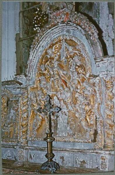 Retable à trois panneaux sculptés : l'Annonciation, l'Assomption, et la Dormition de la Vierge.