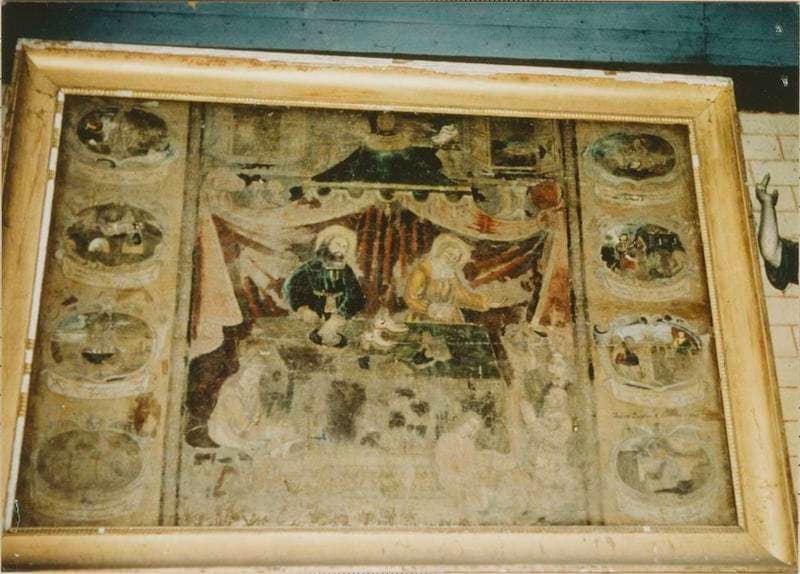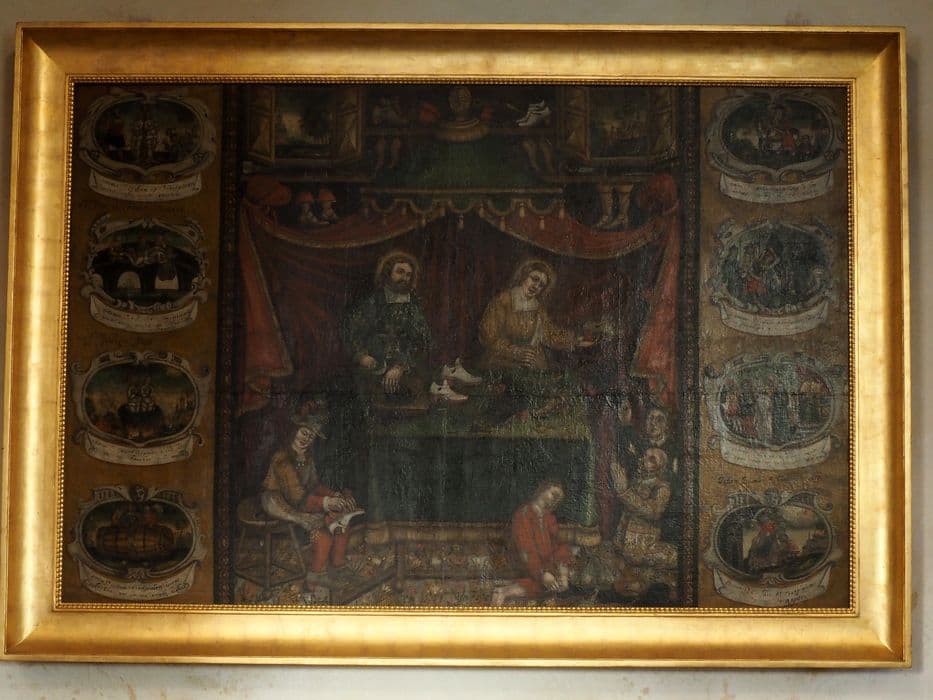 Au centre du tableau figure l'atelier de cordonnerie des saints Crépin et Crépinien, patrons des cordonniers. De chaque côté, des médaillons représentent le martyre subi par les deux frères.